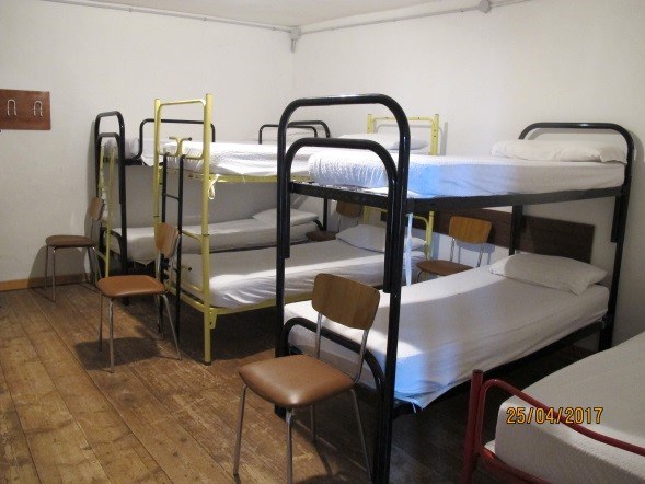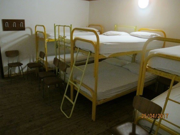 DESCRIZIONE DEL PIANO PRIMO: 1. CAMERA SINGOLA CON 3 POSTI LETTO 2. CAMERA SINGOLA CON 2 POSTI LETTO 3. CAMERA CON 6 POSTI LETTO A CASTELLO 4. CAMERA CON 6 POSTI LETTO A CASTELLO 5. CAMERA CON 7 POSTI LETTO A CASTELLO 6. BAGNO FINESTRATO CON DOCCIA 7. BAGNO FINESTRATO CON DOCCIA